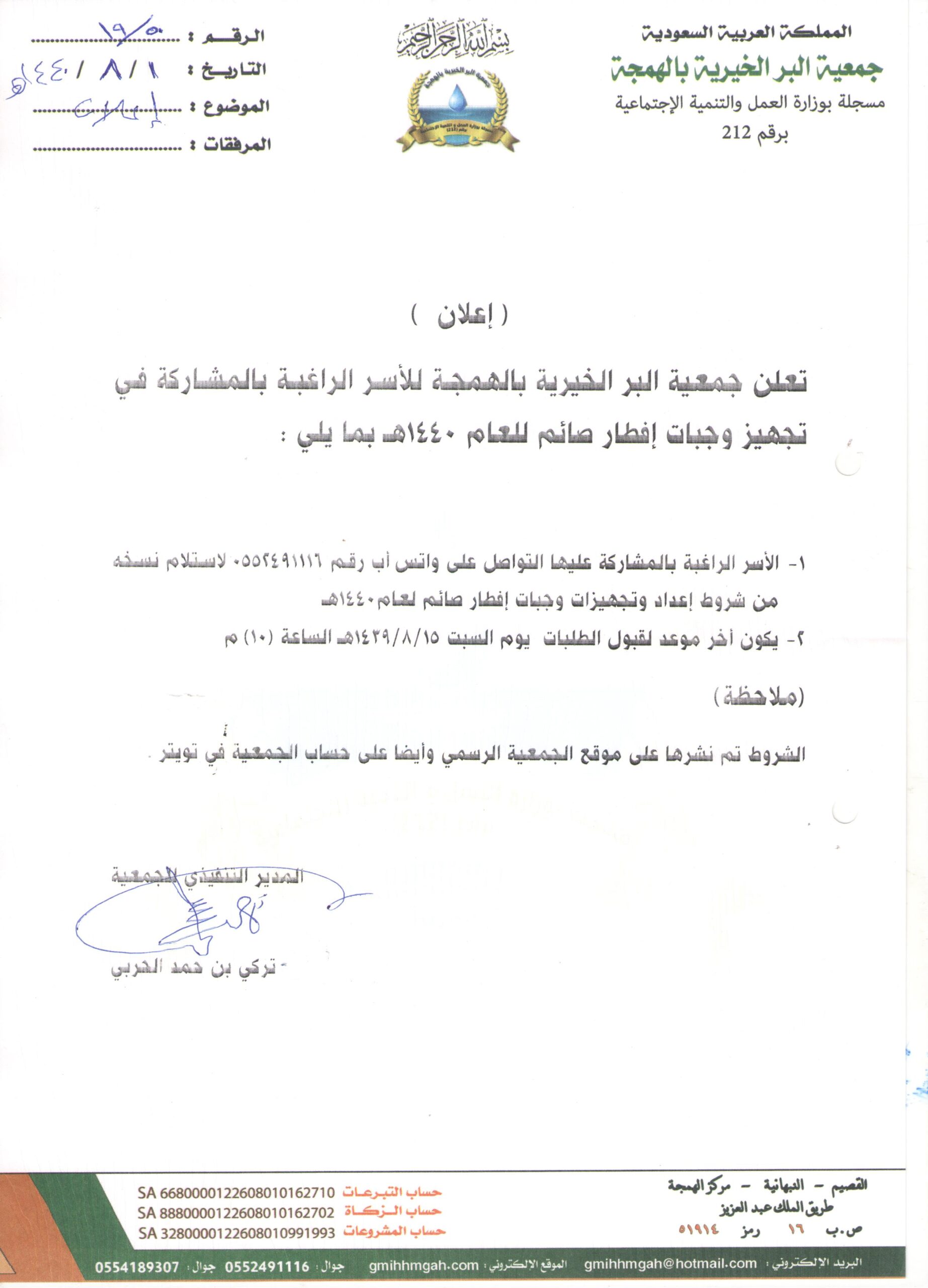 تعلن جمعية البر الخيرية بالهمجة للأسر الراغبة بالمشاركة في تجهيز وجبات افطار صائم للعام 1440 هـــ.