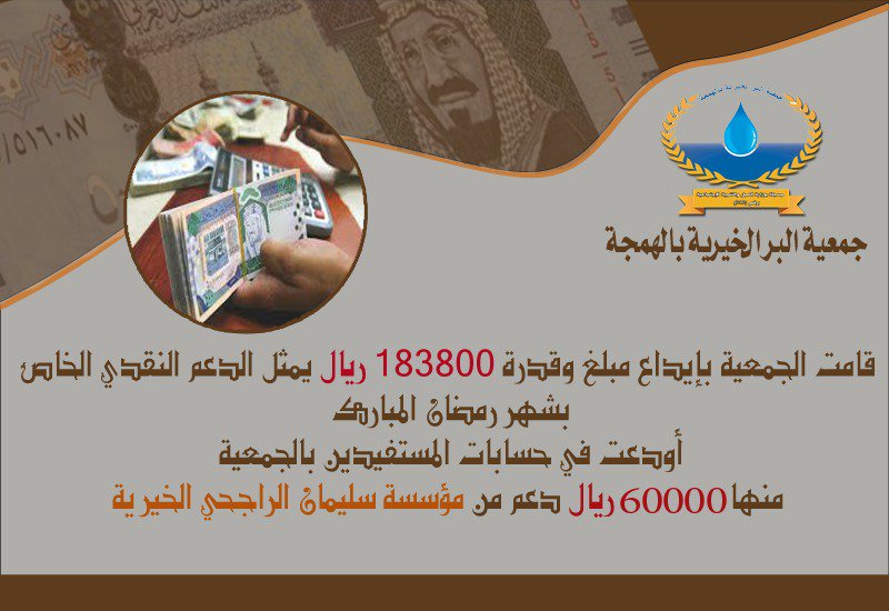 اودعت الجمعية يوم امس الاثنين الدعم النقدي الخاص بشهر رمضان المبارك لعام 1439 حيث بلغ اجمالي الدعم (183800) ريال منها مبلغ وقدرة (60000) ريال دعم من مؤسسة سليمان الراجحي الخيرية . جزاهم الله خيرا وتم الايداع في حسابات المستفيدين مباشرة.@RajhiCF