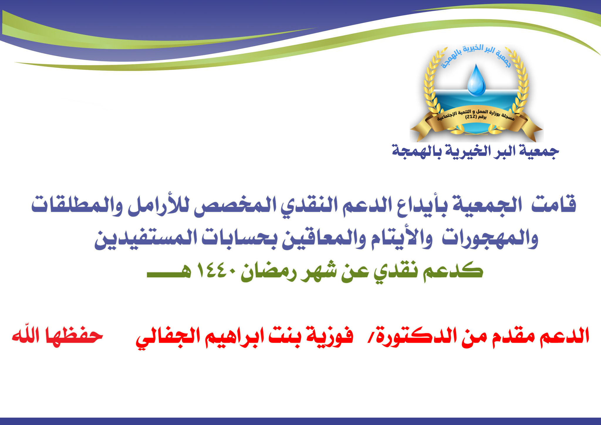 تم ايداع الدعم النقدي المخصص للأرامل والمطلقات والمهجورات والمعاقين والايتام بمبلغ 50 الف ريال دعم مقدم من الدكتورة فوزية بنت ابراهيم الجفالي حفظها الله