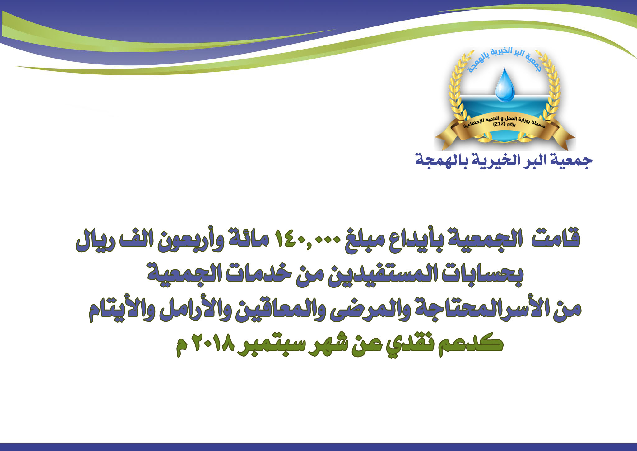 قامت الجمعية بصرف مبلغ 140000 ريال كدعم نقدي للمستفيدين عن شهر سبتمبر 2018 م